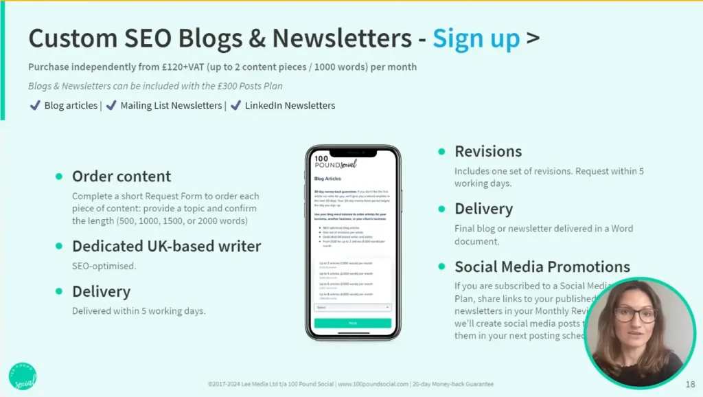 - How much does it cost?Plans start at £100/month + VAT. We offer various posting frequencies and add-ons such as blogs and LinkedIn lead generation. See our pricing page for full details.