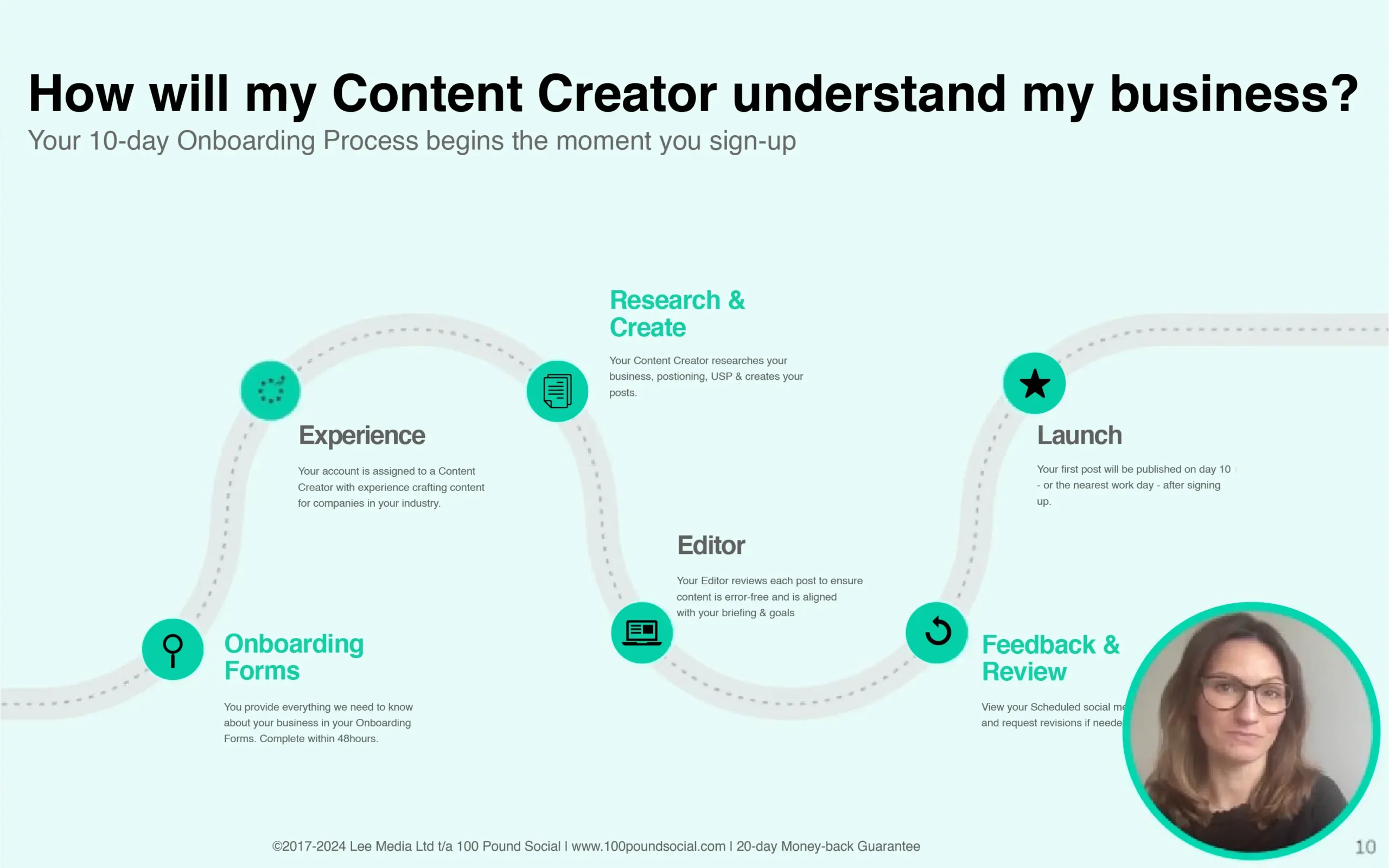 - How do I get started?Just select your plan, complete the onboarding form, and our team will take it from there. You'll receive your first content draft within 10 working days for approval before anything is published.