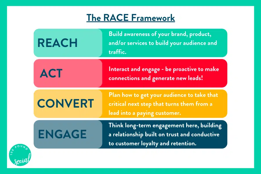 Note that all businesses are unique and can’t adopt common plans to succeed. Ensure you analyse your firm’s operations and customers before creating a plan. Use the RACE framework approach to funnel your sales – Reach, Act, Convert, Engage.