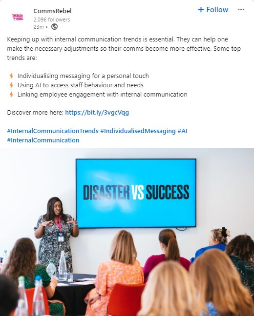 After closely monitoring the CommsRebel LinkedIn page, she reports that within the last 12 months: “We’ve had about 871 new followers, which is about a 43% increase; it might be 45%, almost 50%.”