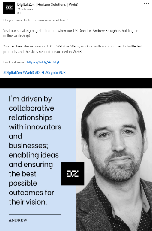 Relevant and interesting social media posts created by 100 Pound Social have given Digital Zen a strong online presence, with Andrew saying, “it’s provided life to the company on LinkedIn, creating the right placement and credibility.”