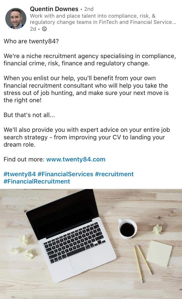 Since then, we have created and published posts to Twenty84’s Company LinkedIn page and Quentin’s personal LinkedIn profile.