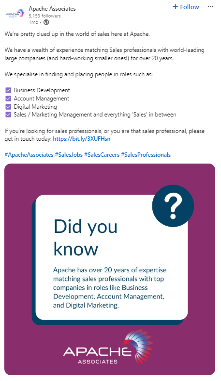Their plan includes the creation and publication of regular social media posts to Director Glen Bird’s personal LinkedIn as well as to the Apache Associates company LinkedIn page.