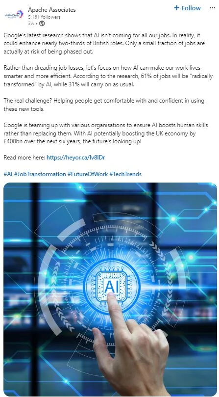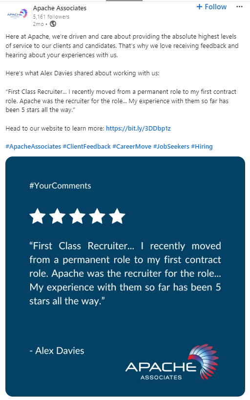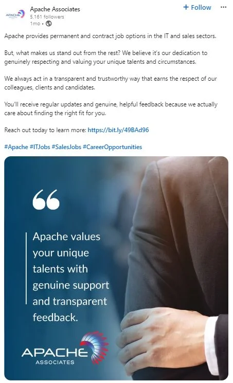 Regular and relevant social media posts by 100 Pound Social have led to Apache Associates seeing consistent growth in engagement on its LinkedIn page and Glen’s profile.