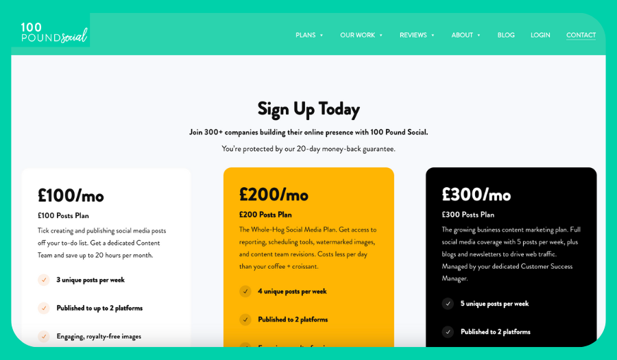 In a world where marketing budgets can quickly spiral out of control, 100 Pound Social’s transparent pricing (the clue is in the name) allows businesses of all sizes to access top-notch social media content marketing without breaking the bank.